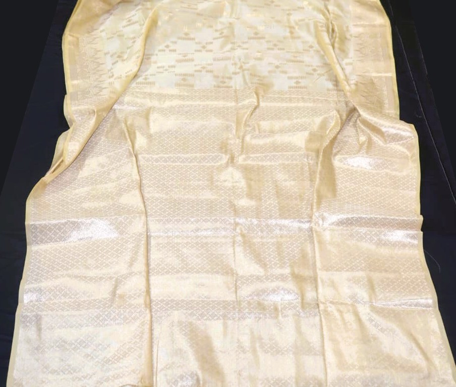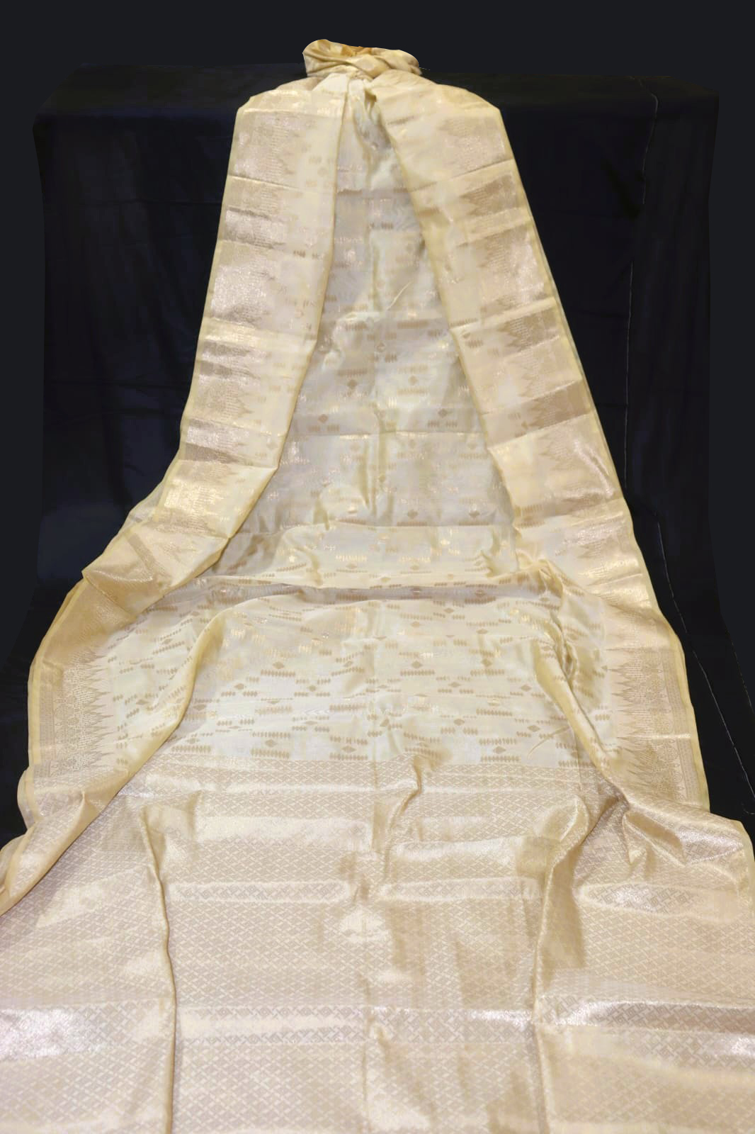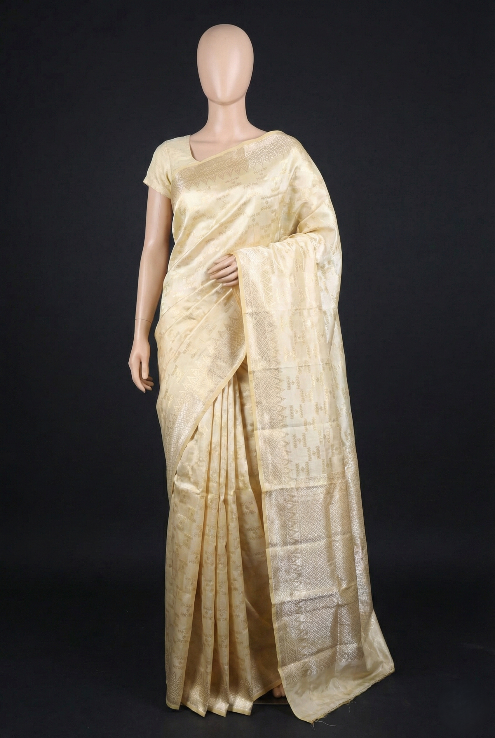 Dress Details: An off-white blended silk saree with geometric motifs all over the body and minimal detailing in anchal. Blouse piece included.