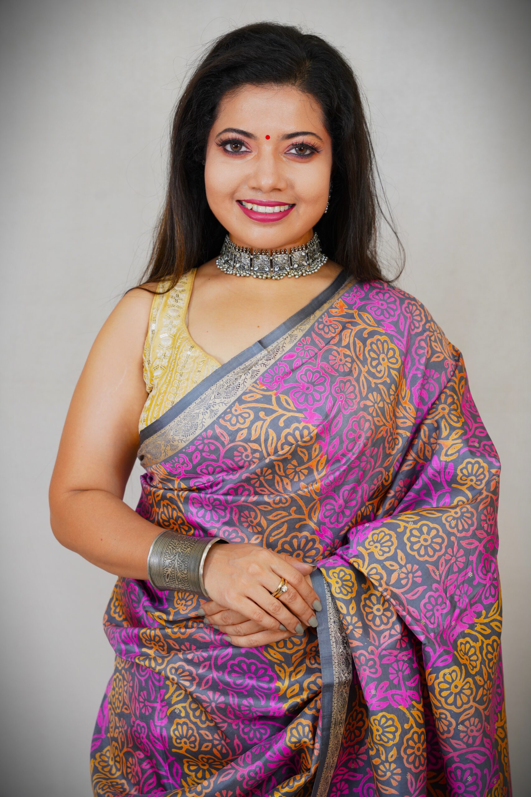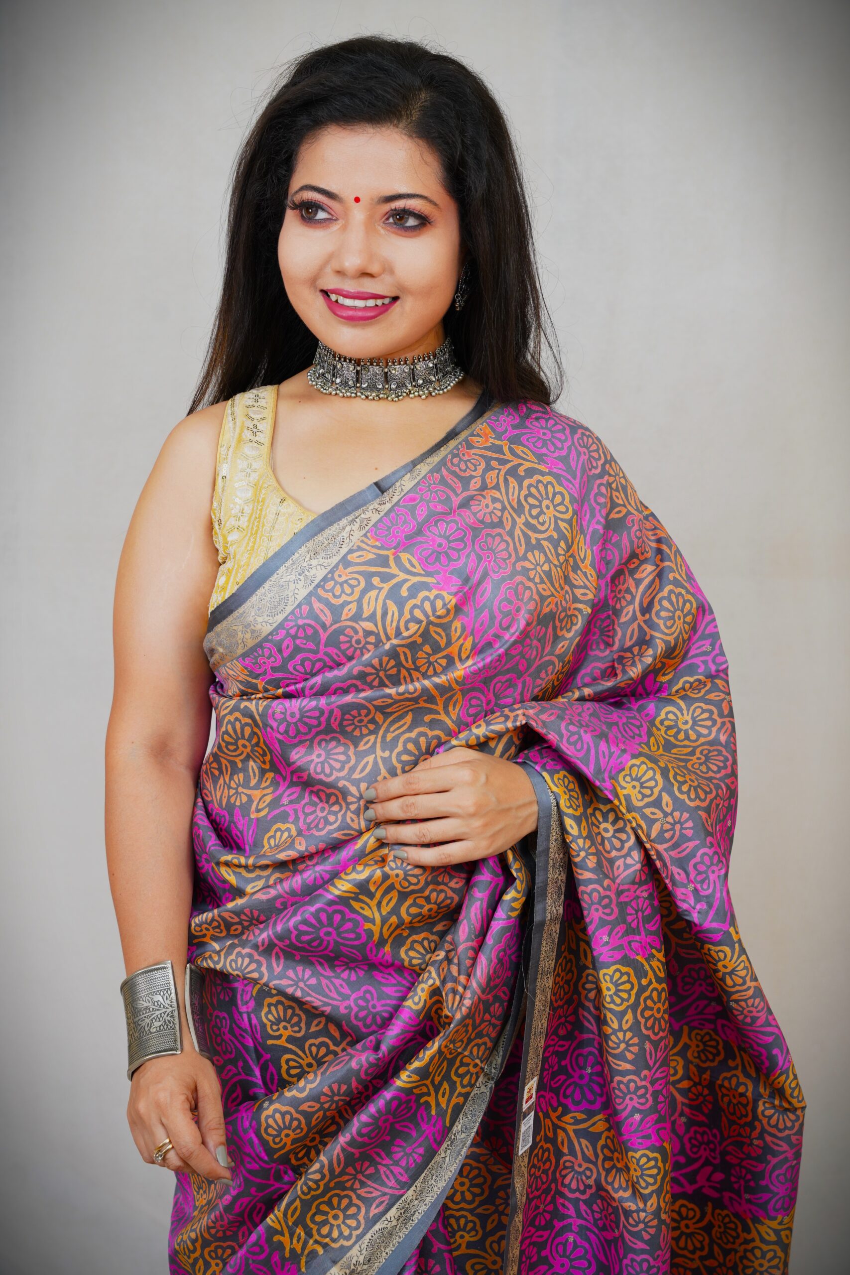 Dress Details: Pure silk saree with all-over multi-colour prints and stone studded grey anchal. Blouse piece not attached.
