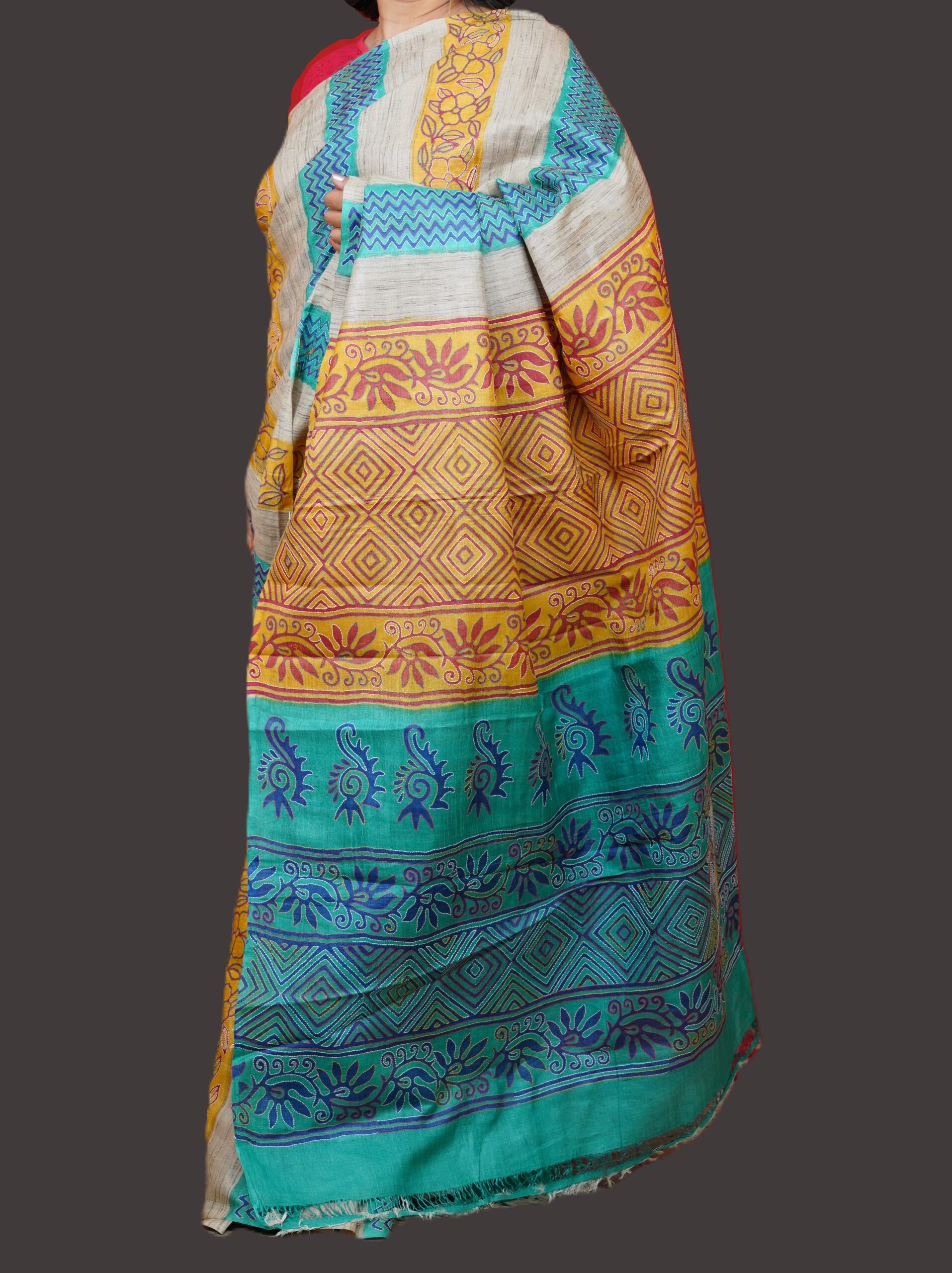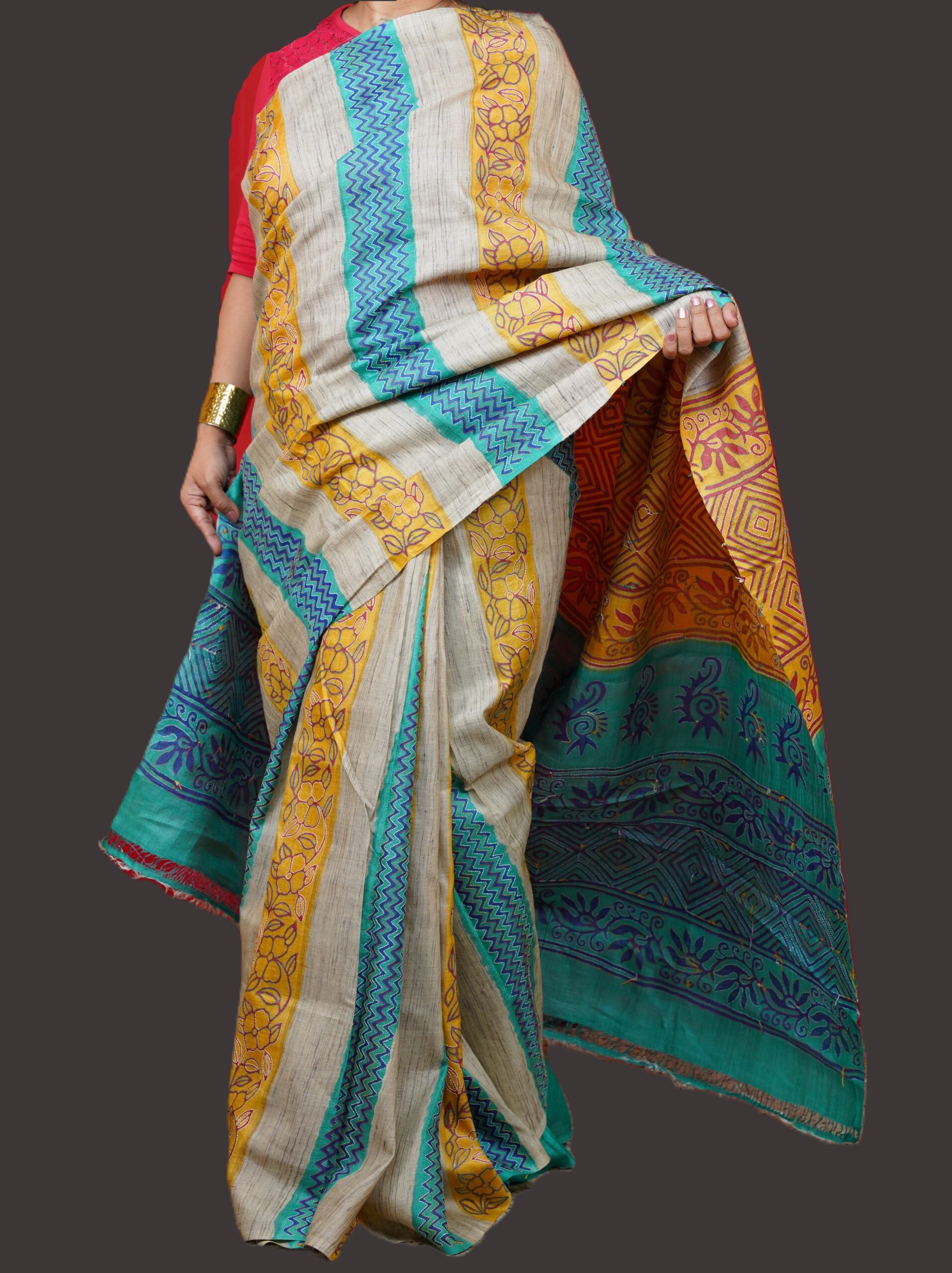 Dress Details: A saree featuring alternate weaves of tussar and katan silk, adorned by kantha embroidery. Blouse piece attached