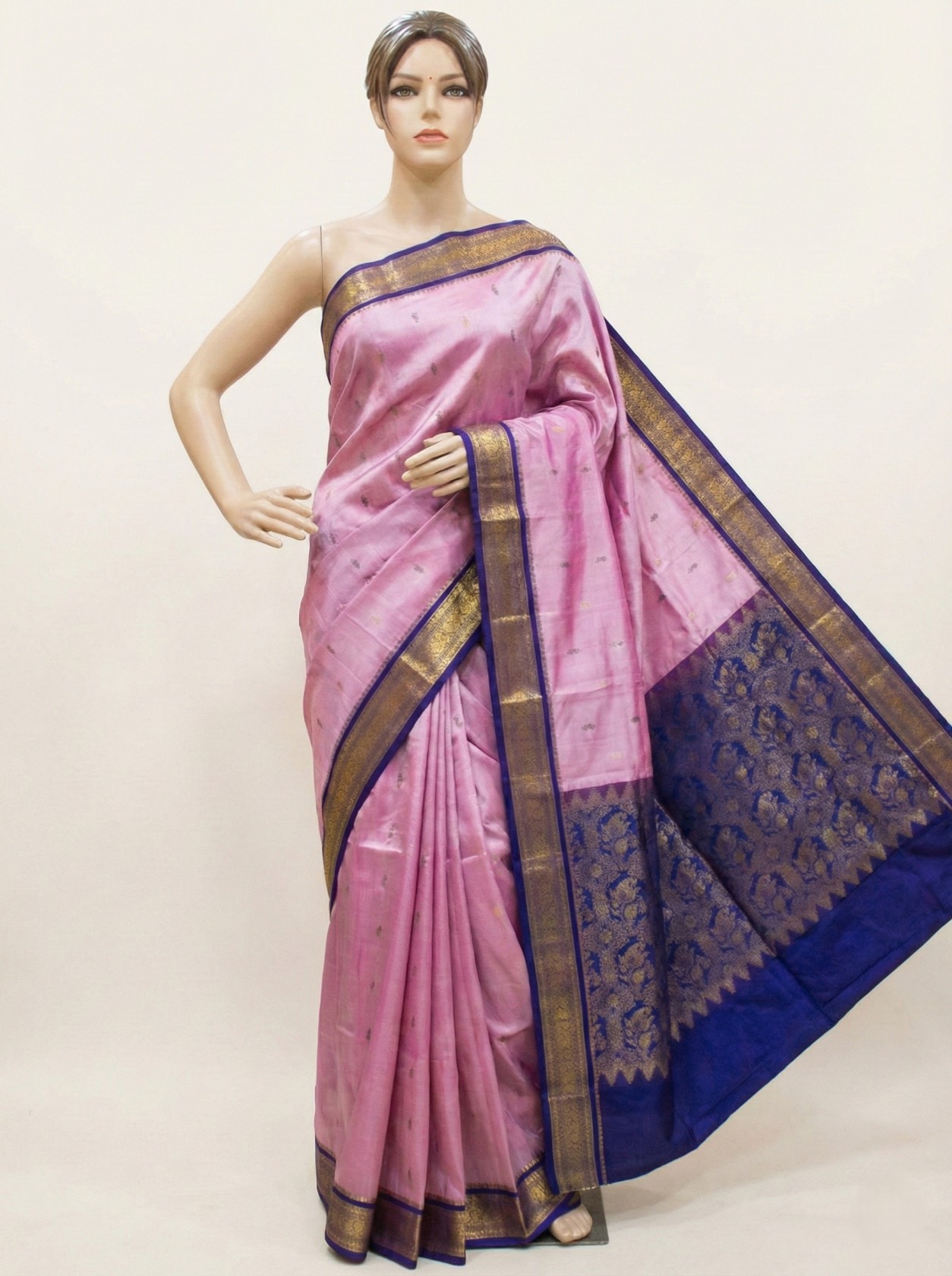 Dress Details: A light pink coloured pure silk kanjivaram saree with contrast anchal and border. Blouse piece available.