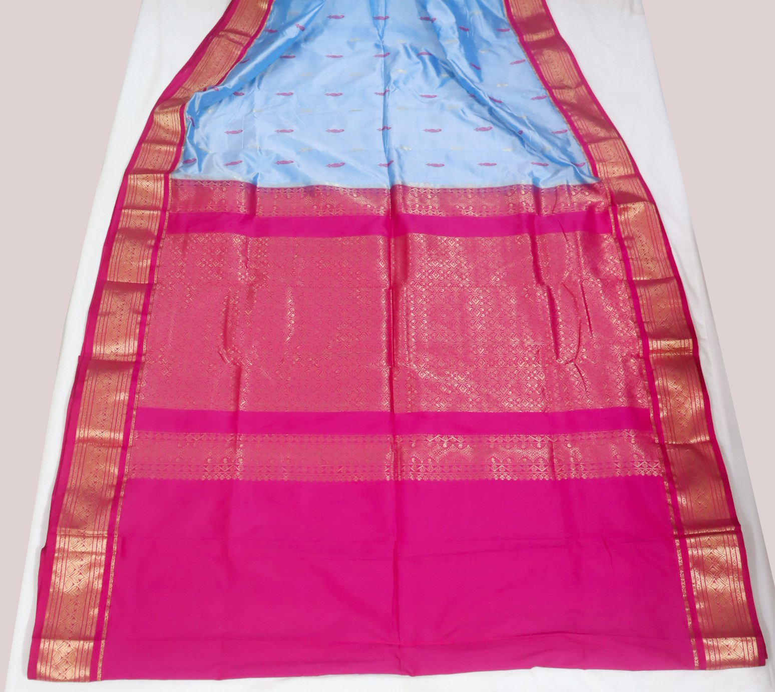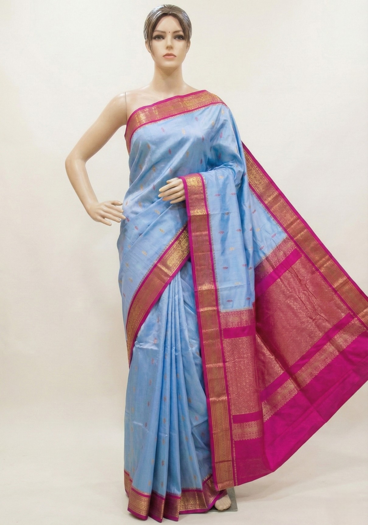 Dress Details: A light blue coloured pure silk kanjivaram saree with contrast anchal and border.Blouse piece available.