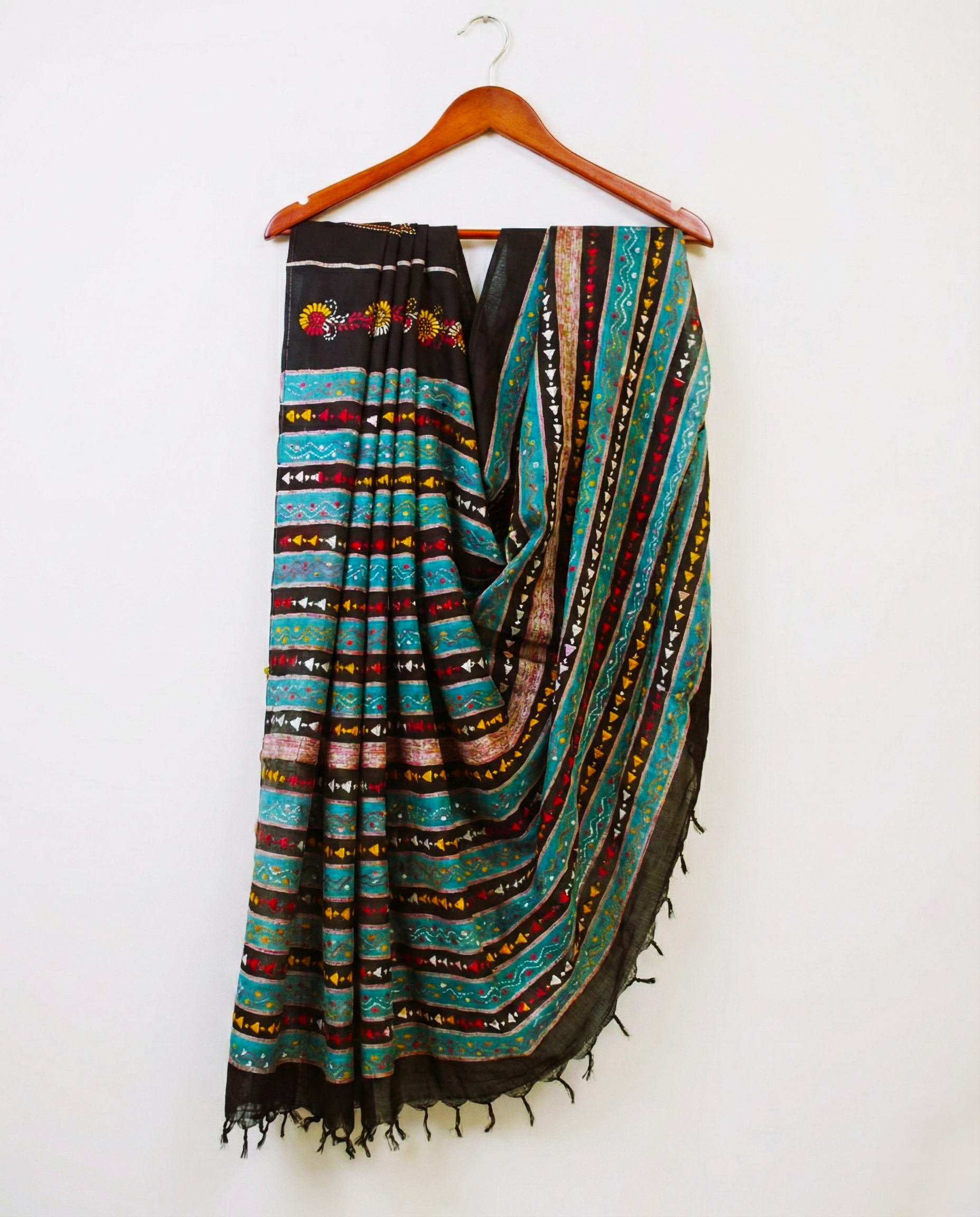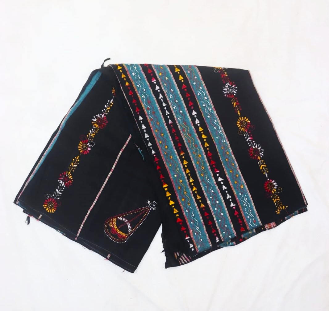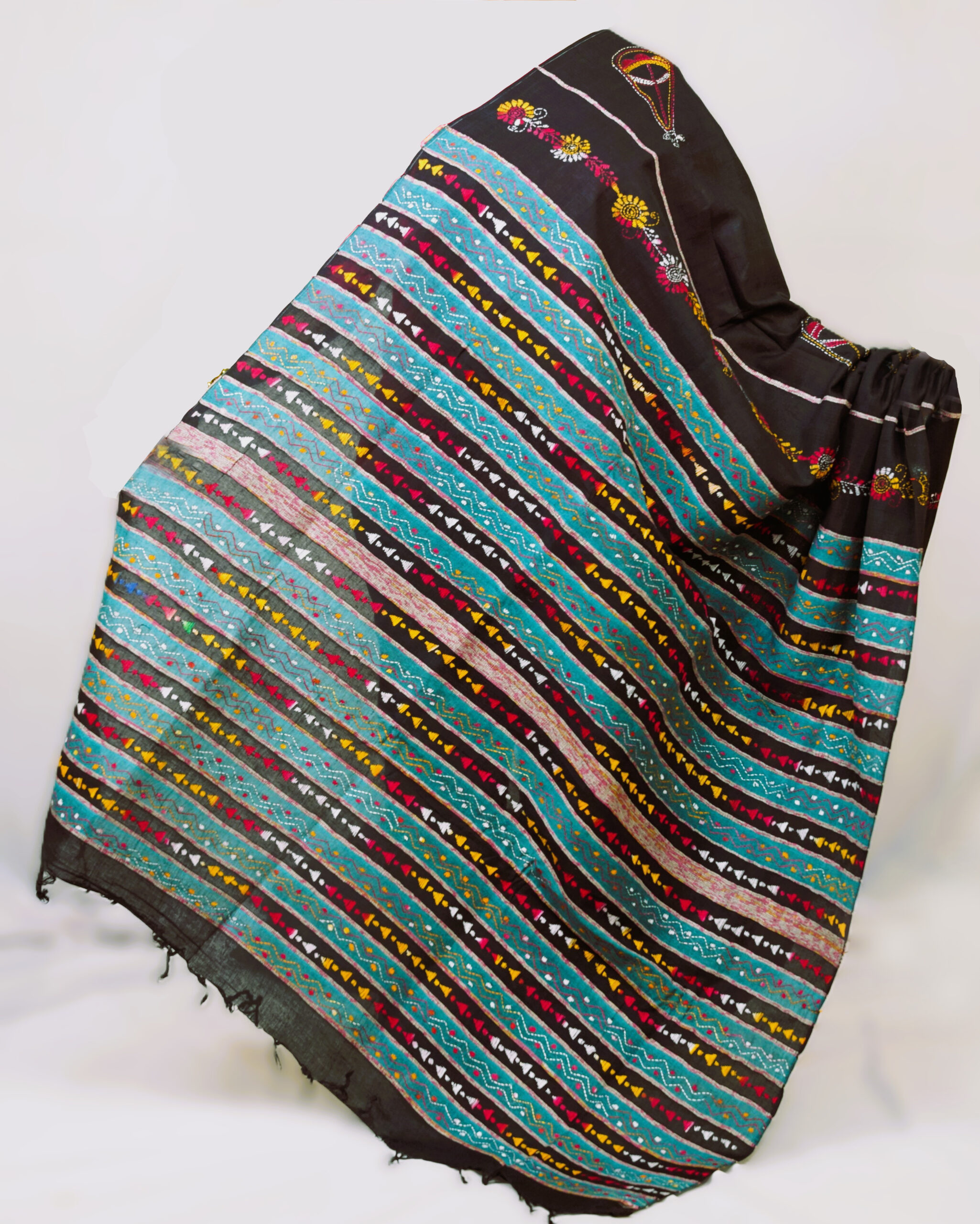 Dress Details: A khesh cotton kantha stitch saree in black, with teal coloured embroideried anchal. Blouse piece included.