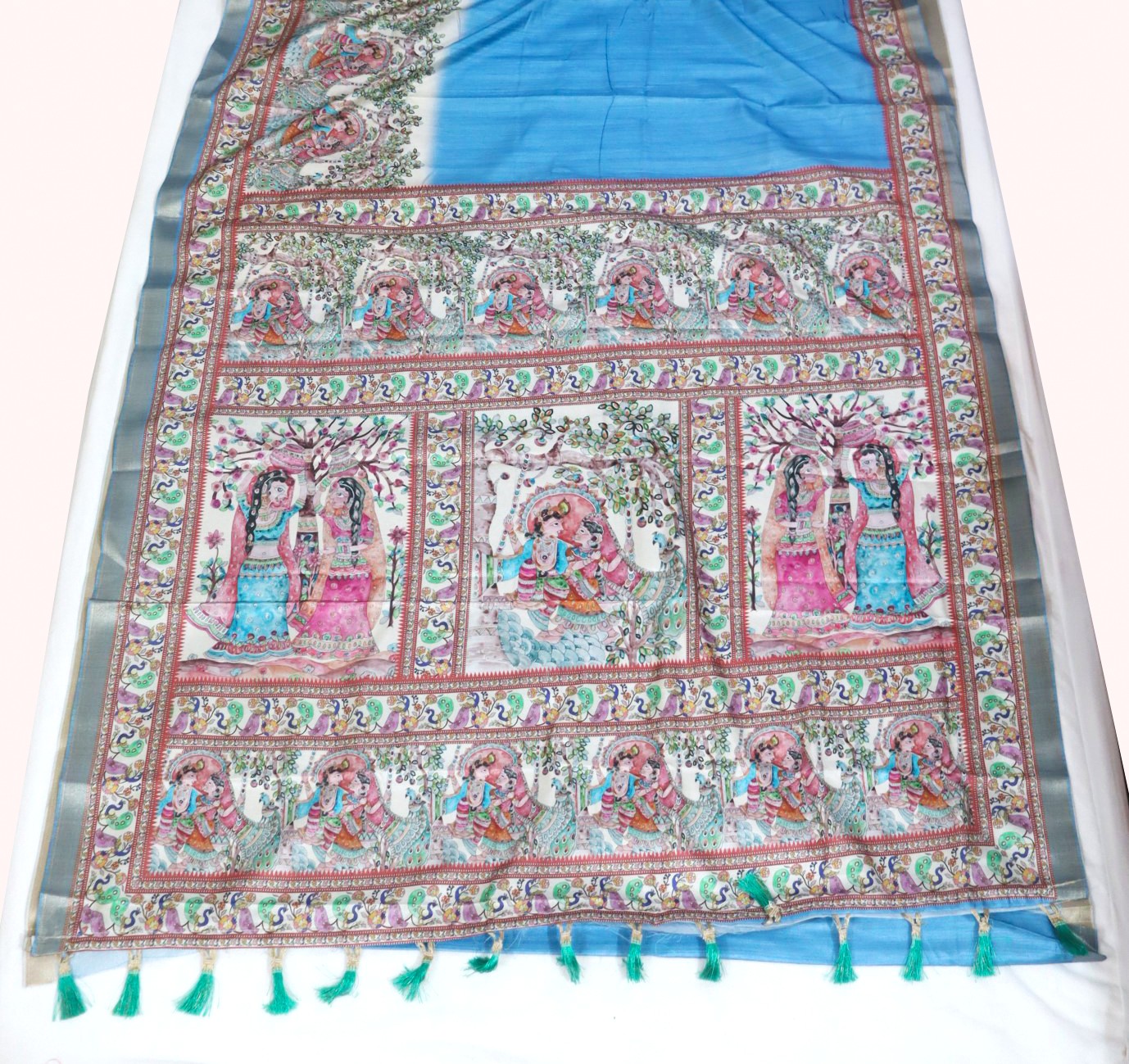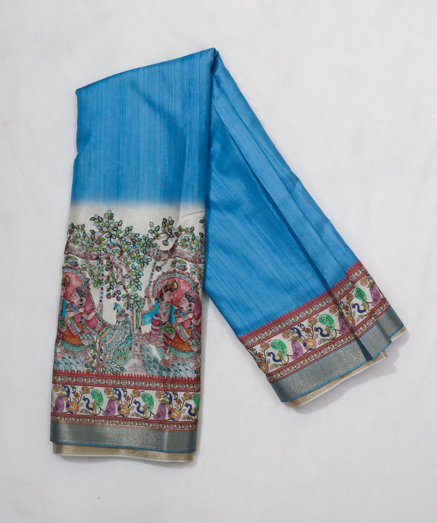 Dress Details: An ocean blue coloured semi silk saree featuring madhubani print patterns on anchal and borders. Blouse piece available.