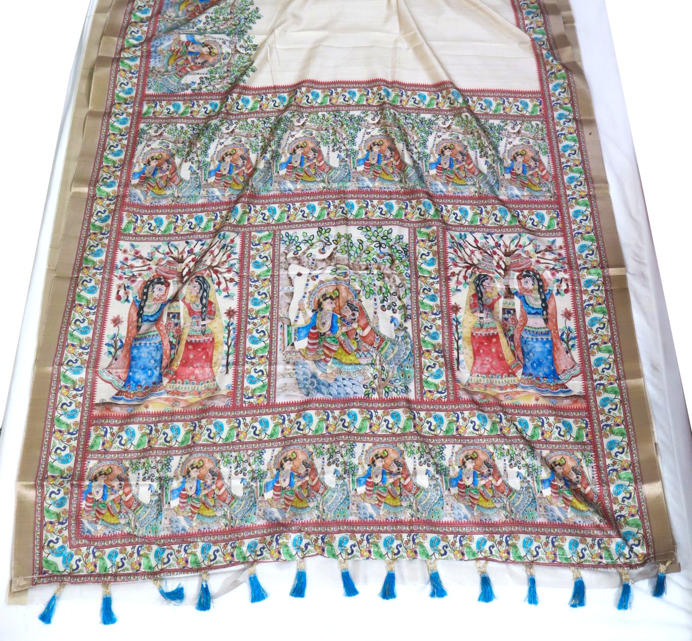 Enjoy all the attention you deserve in this madhubani print saree in vibrant colour combinations!