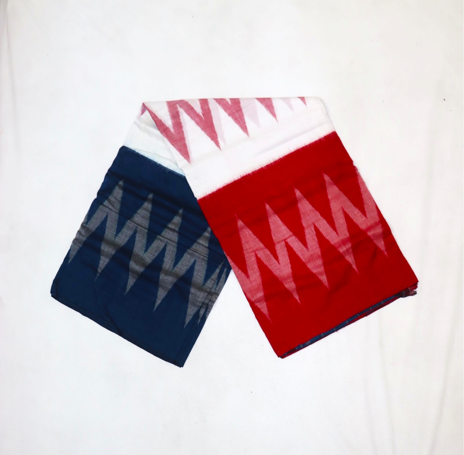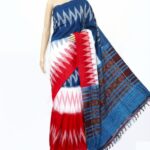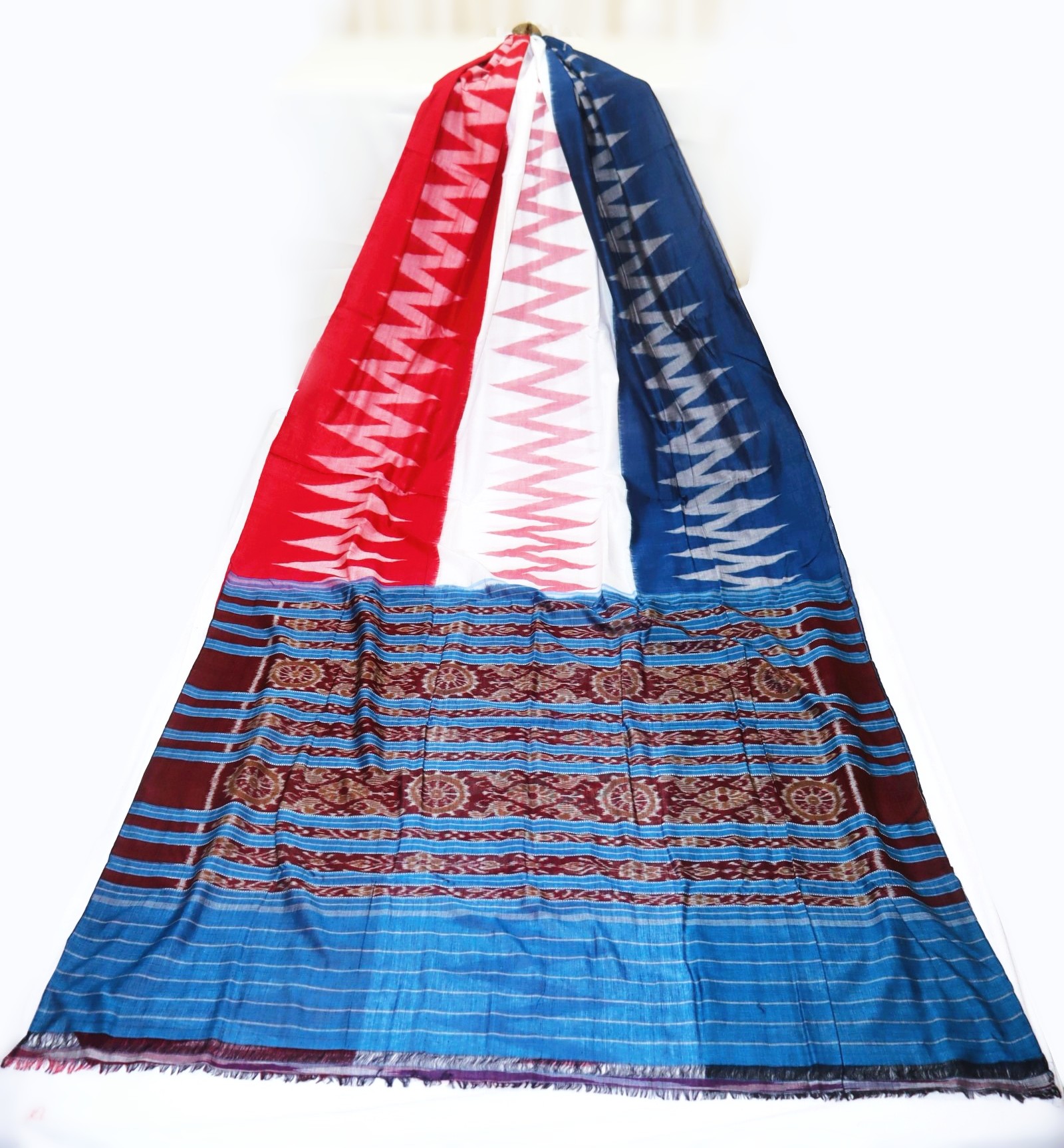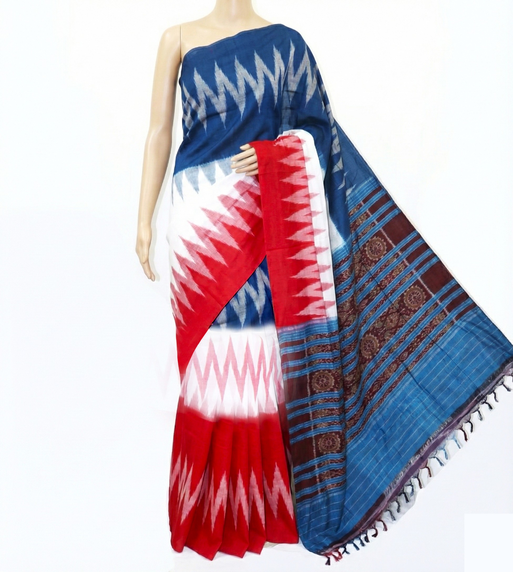 Dress Details: A red, white & blue coloured cotton Sambalpuri Ikkat saree with temple border. Blouse piece not included.