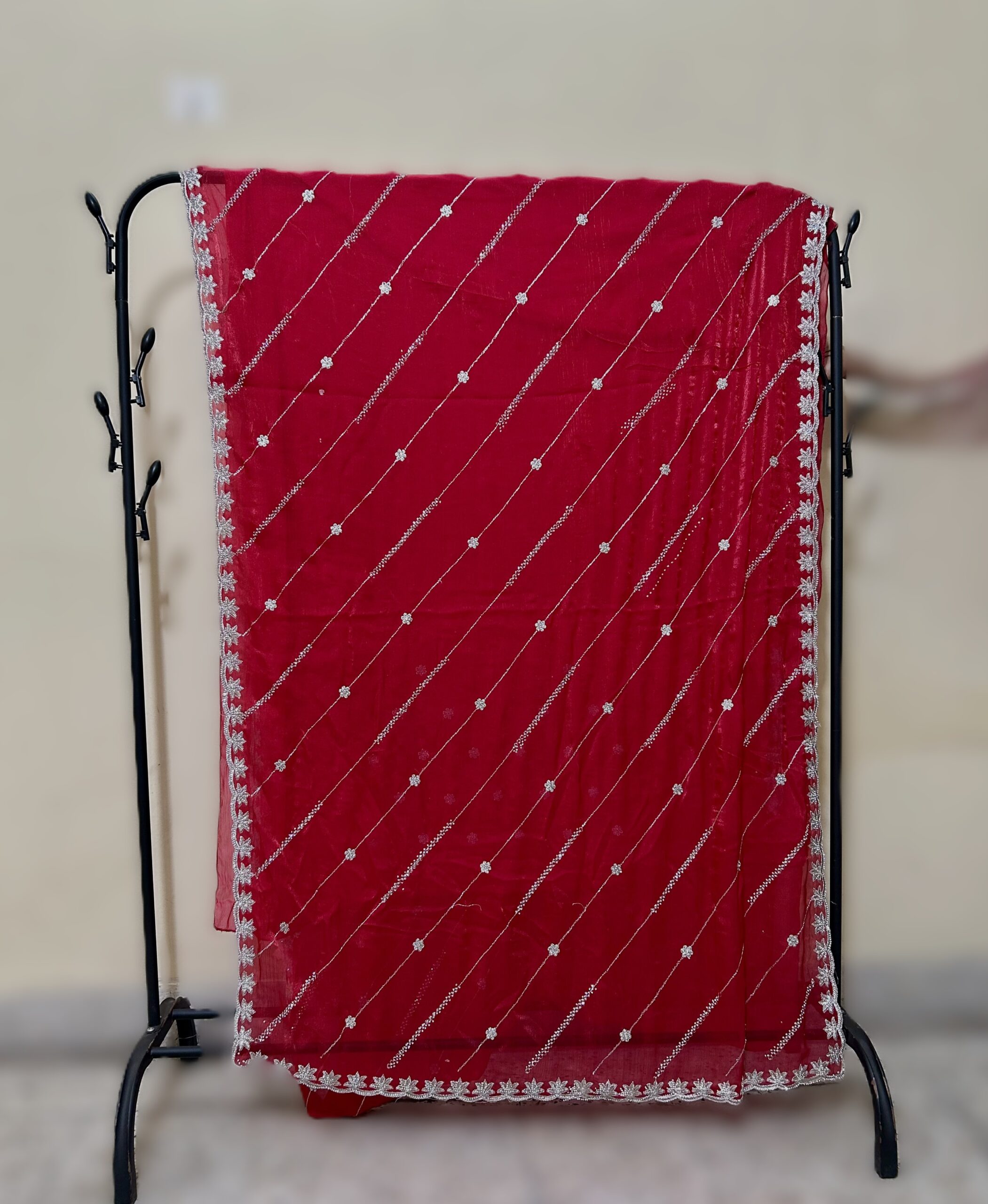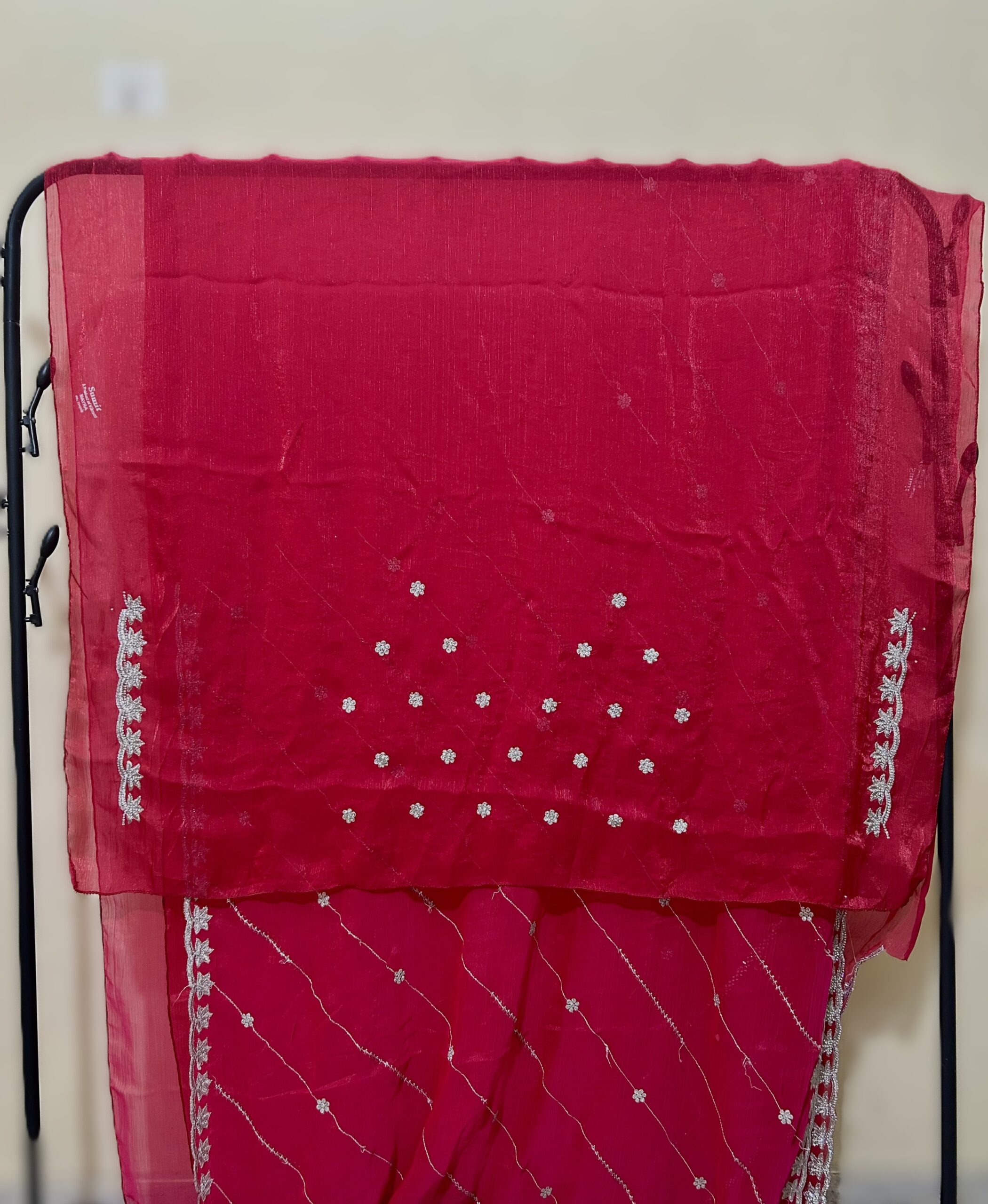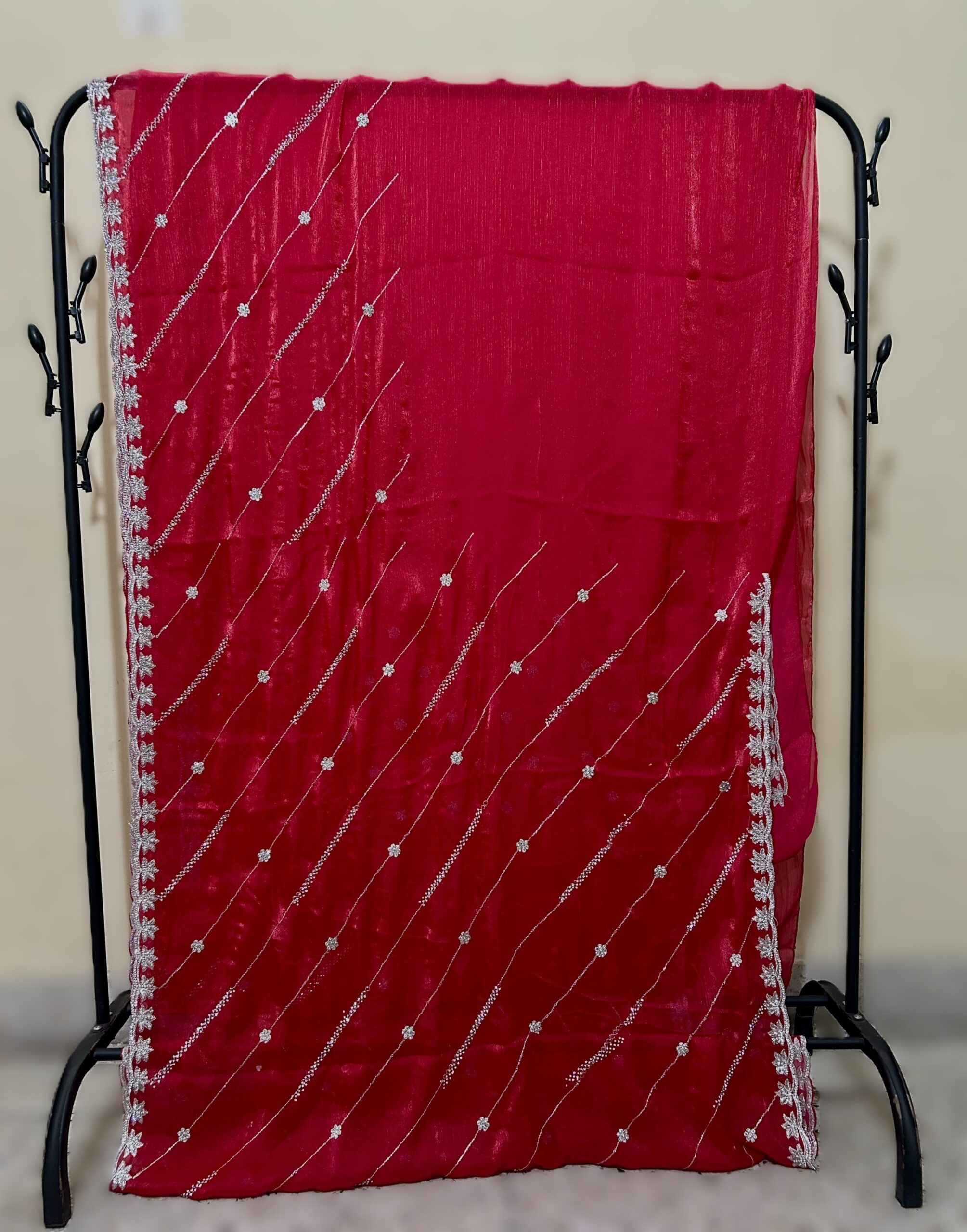 Dress Details: Chiffon saree with stone studded detailings all over. Blouse piece attached