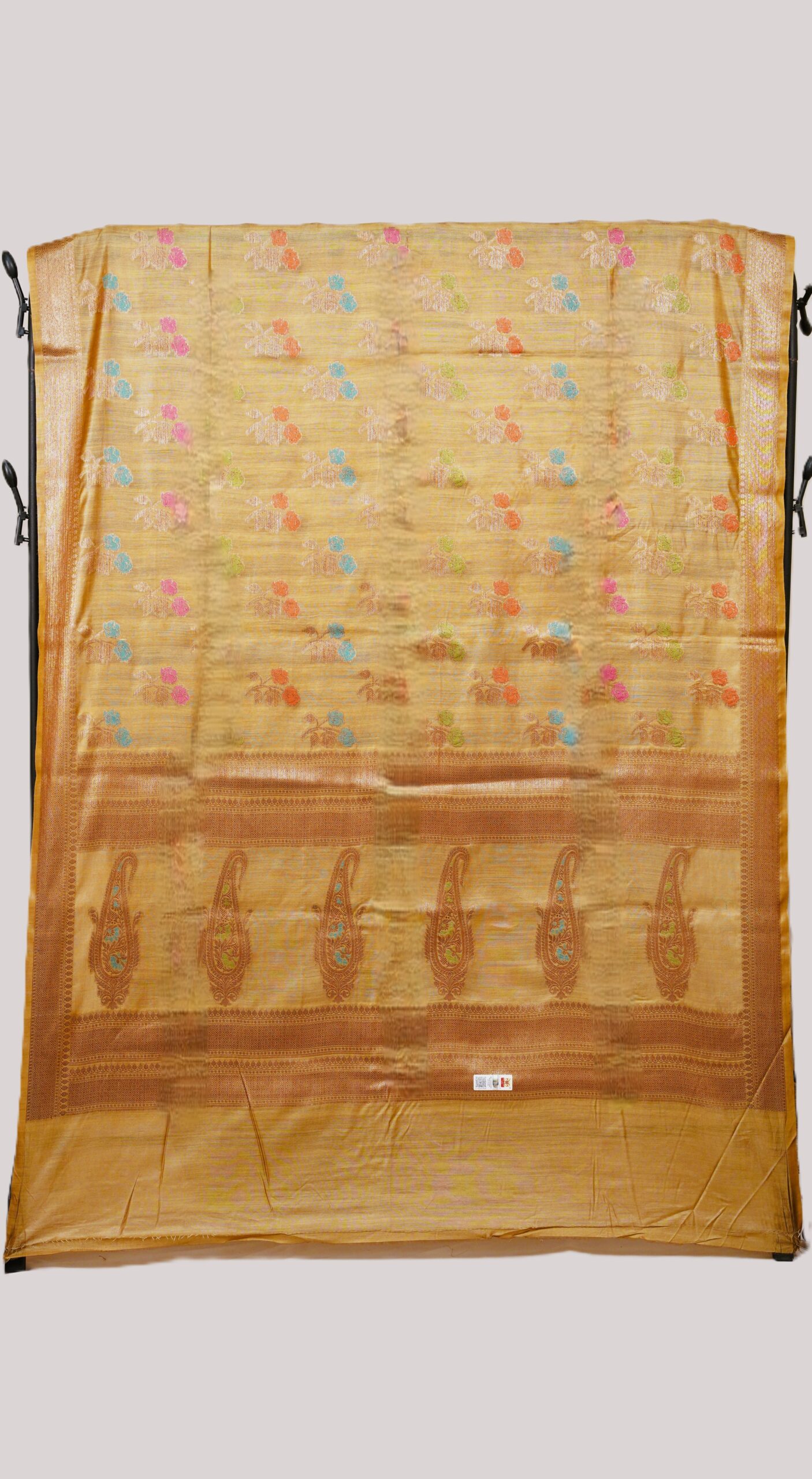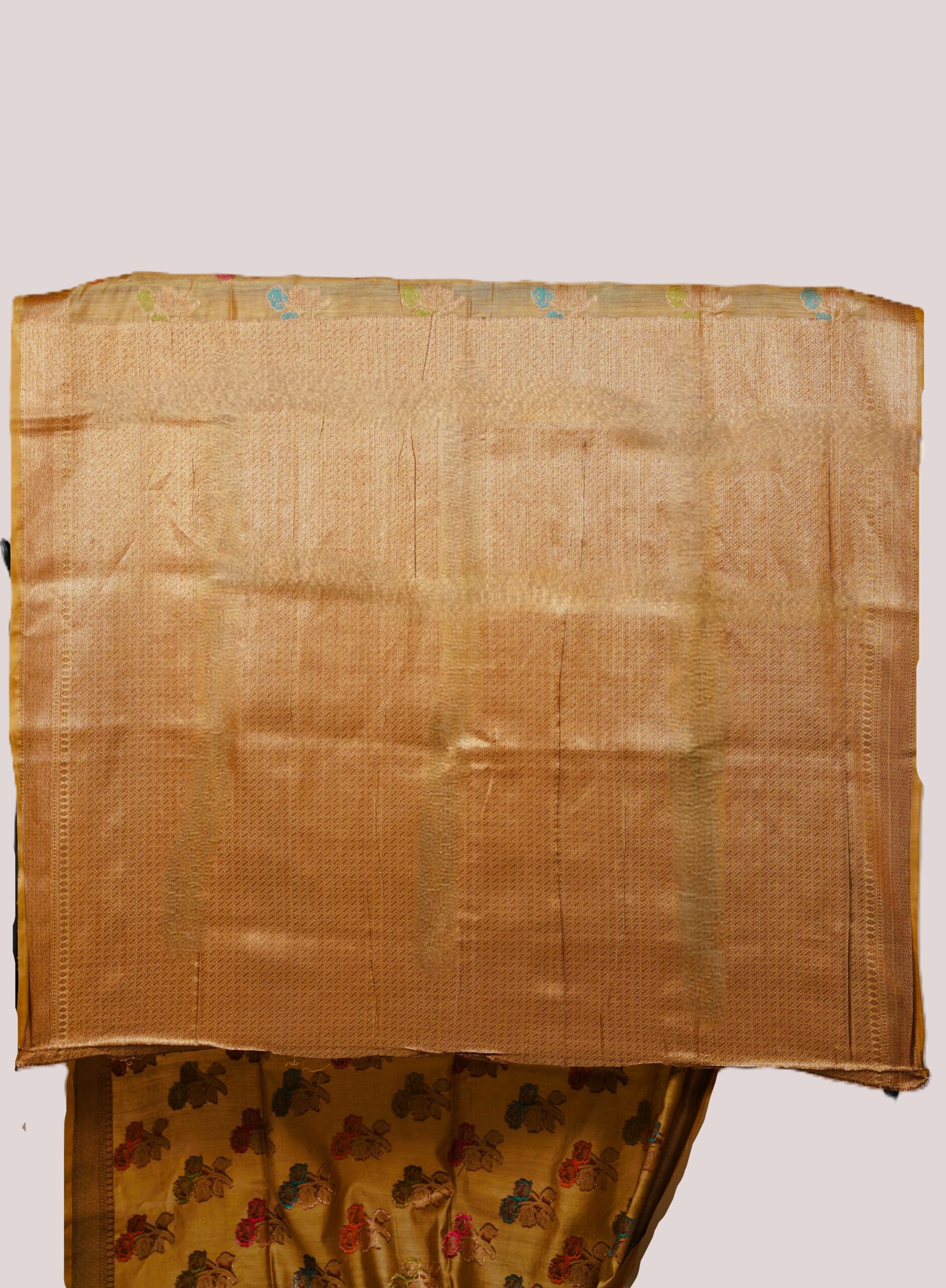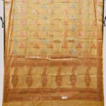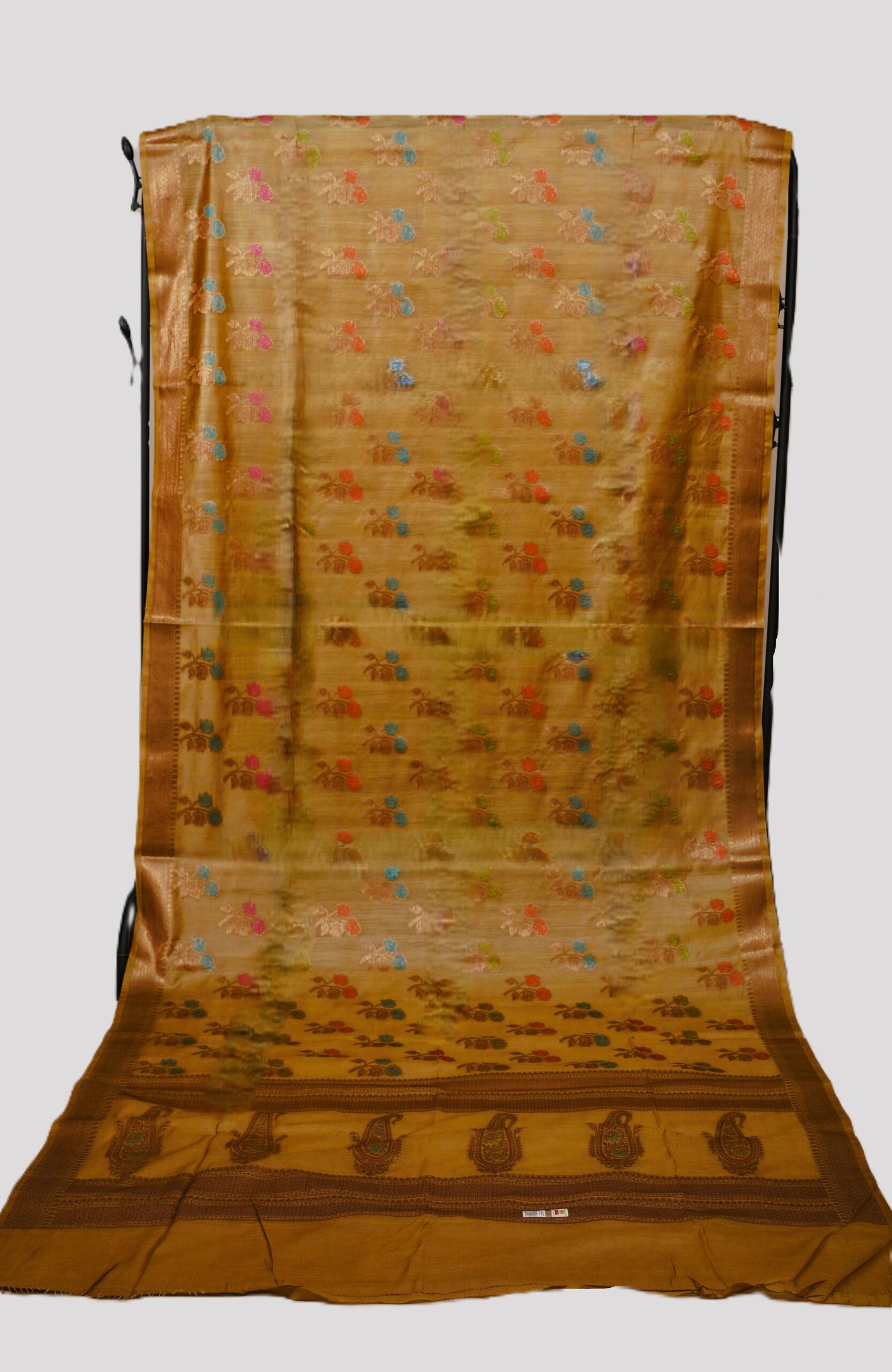 Dress Details: A blended muga silk saree featuring delicate floral motifs woven with golden zari. Blouse piece included.