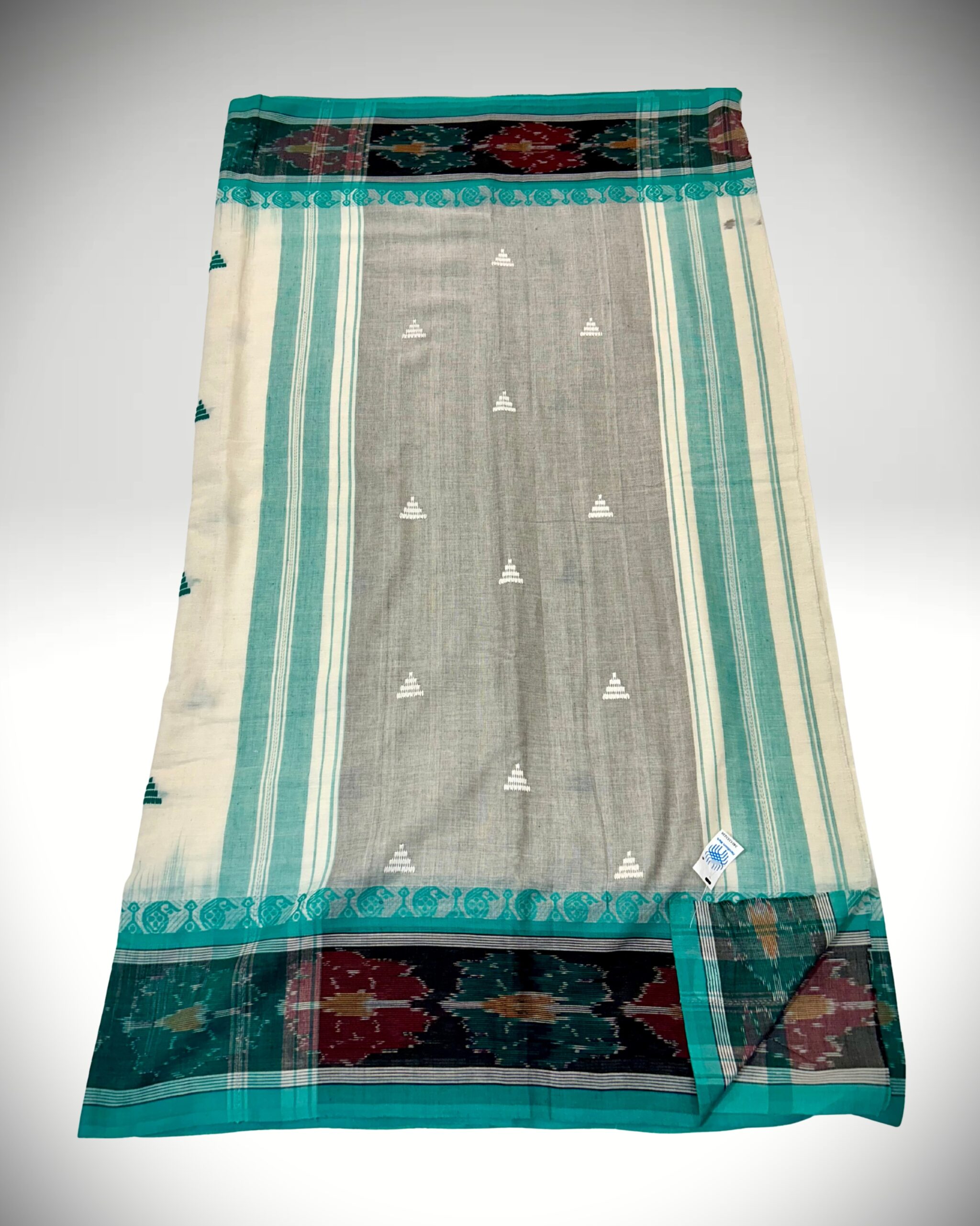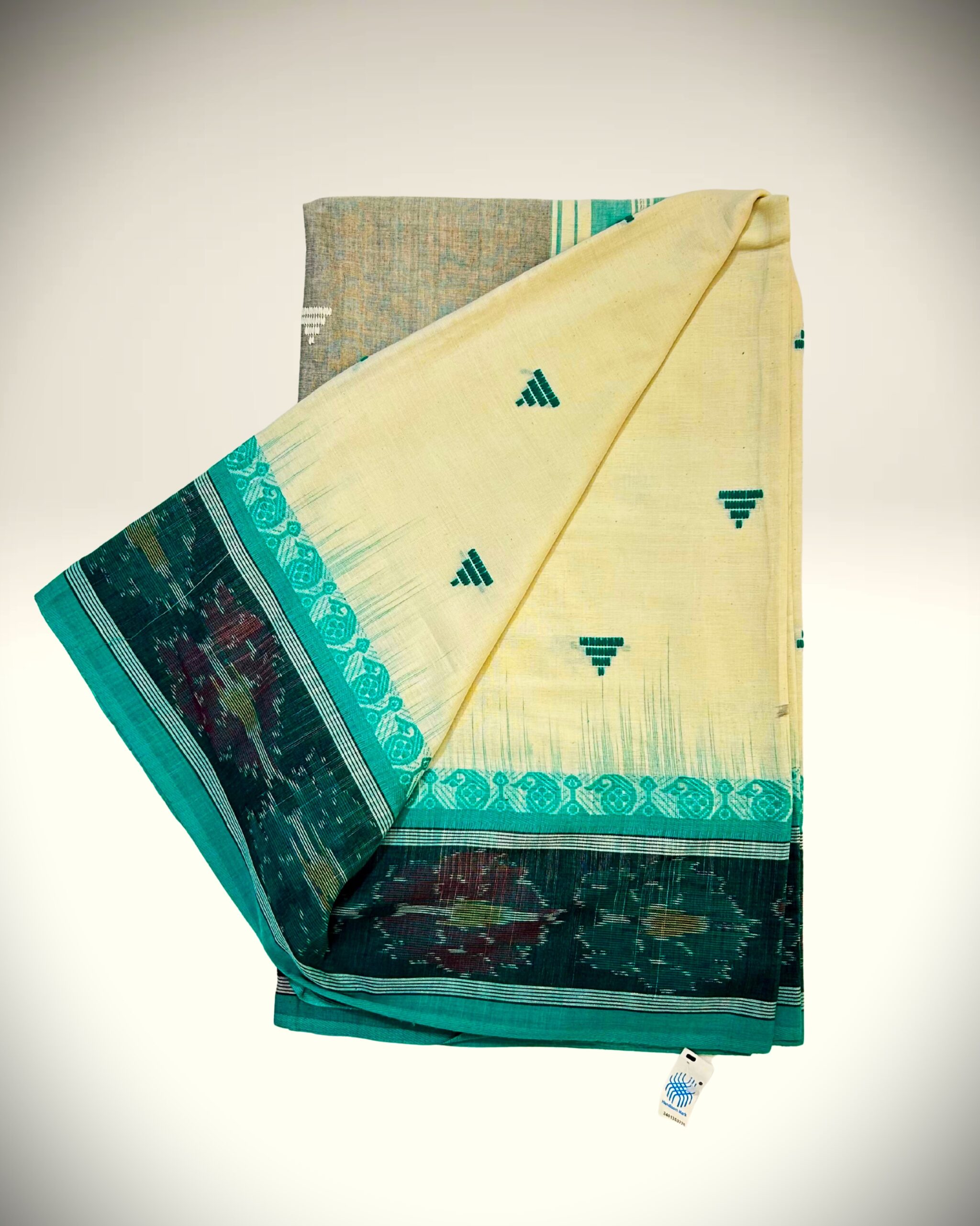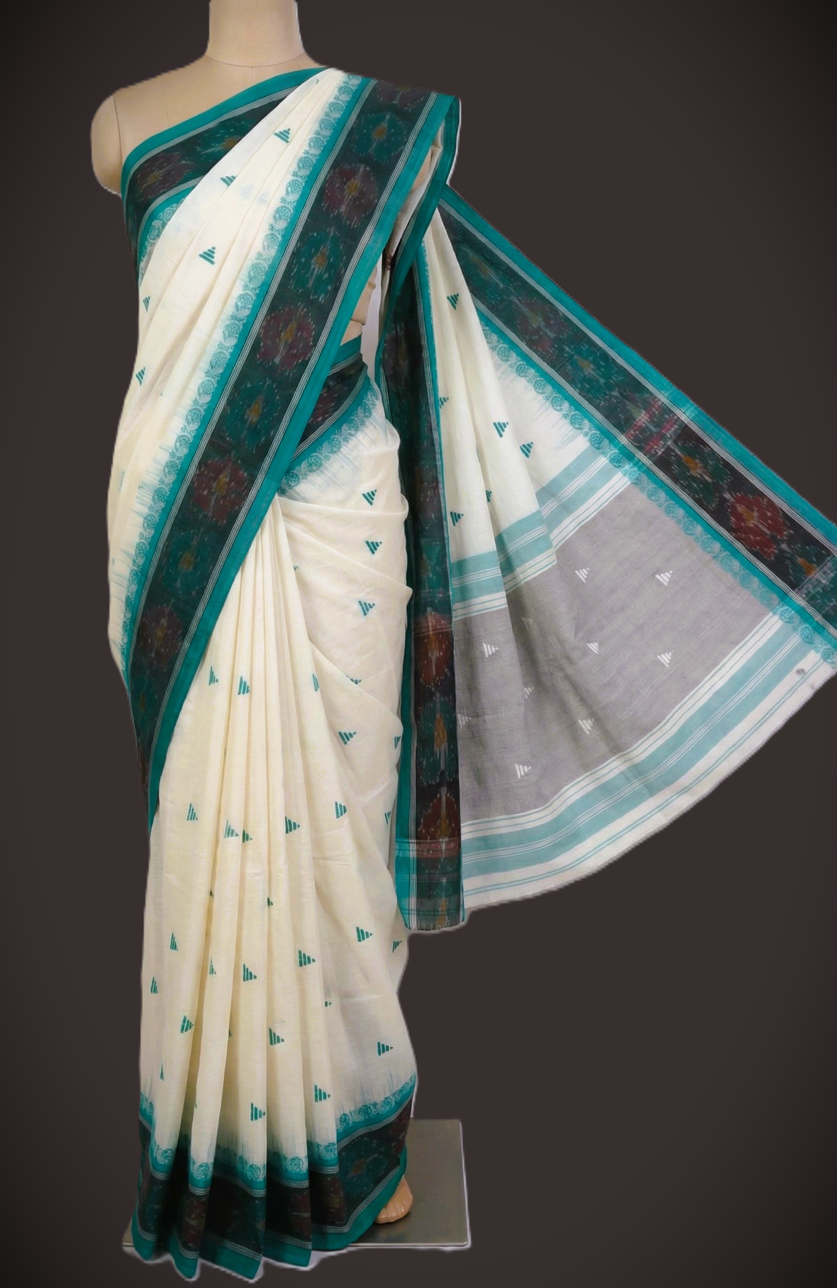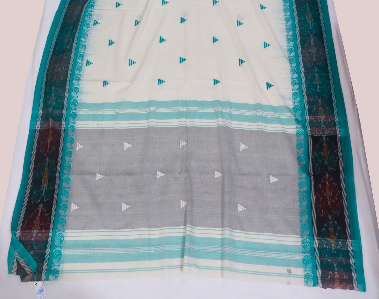Dress Details: A pure handloom cotton saree with contrast border and small woven designs on the body. Blouse piece available.