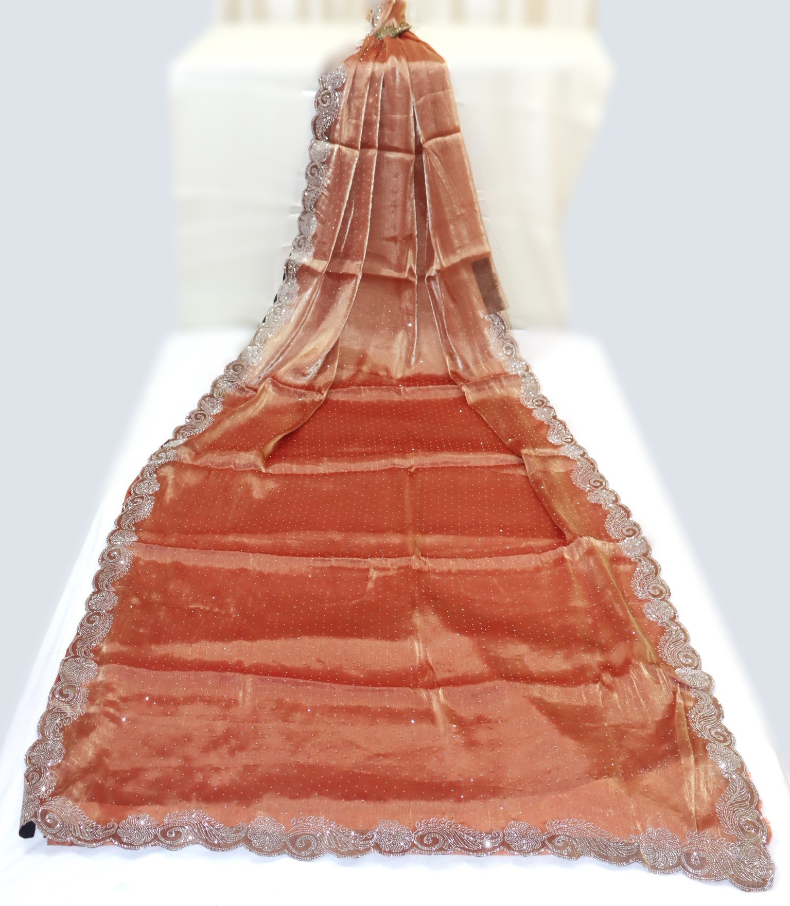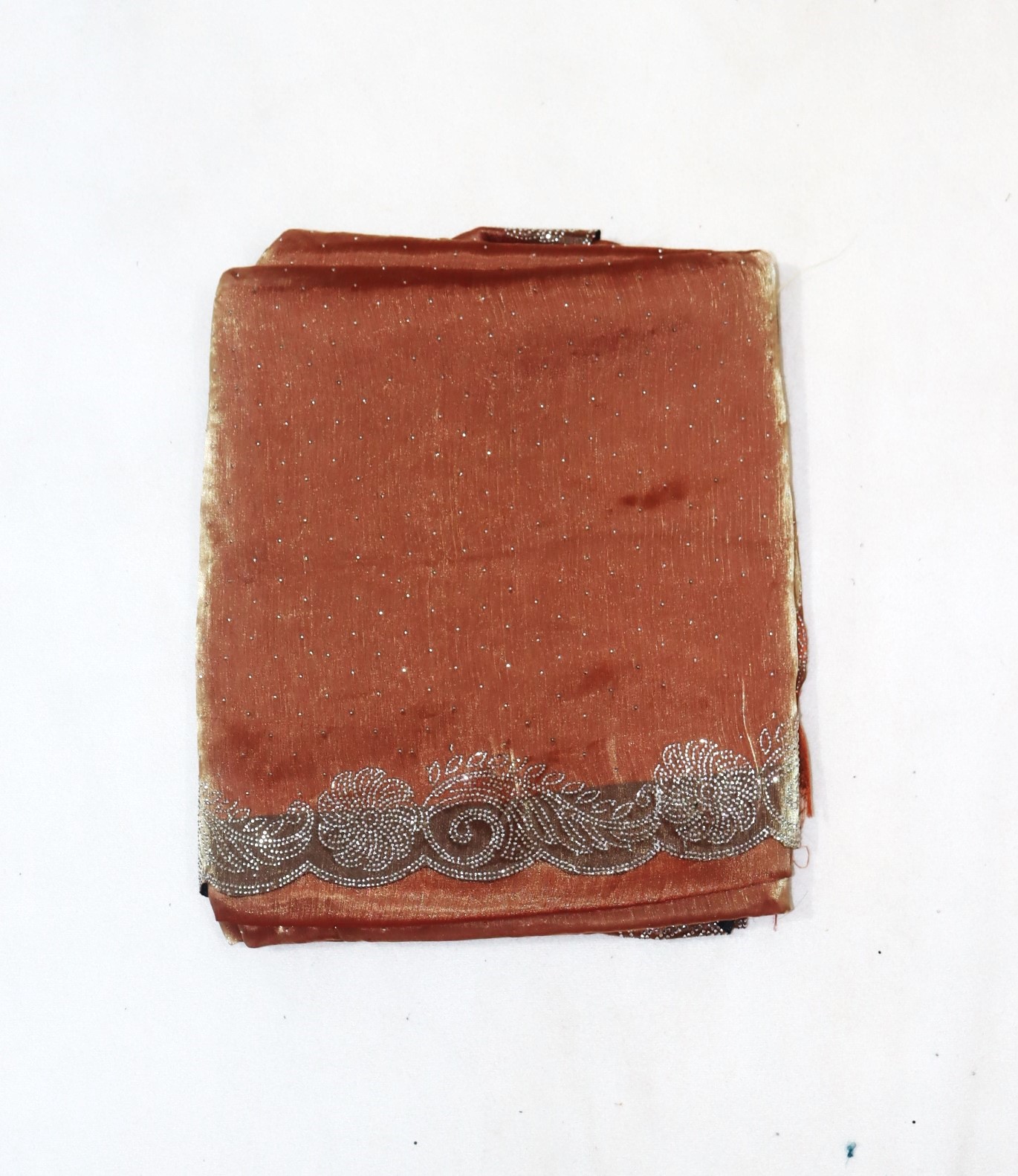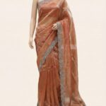 Dress Details: Jimi Chu saree in sea rust red shade with stone embellised border. Blouse piece not available.