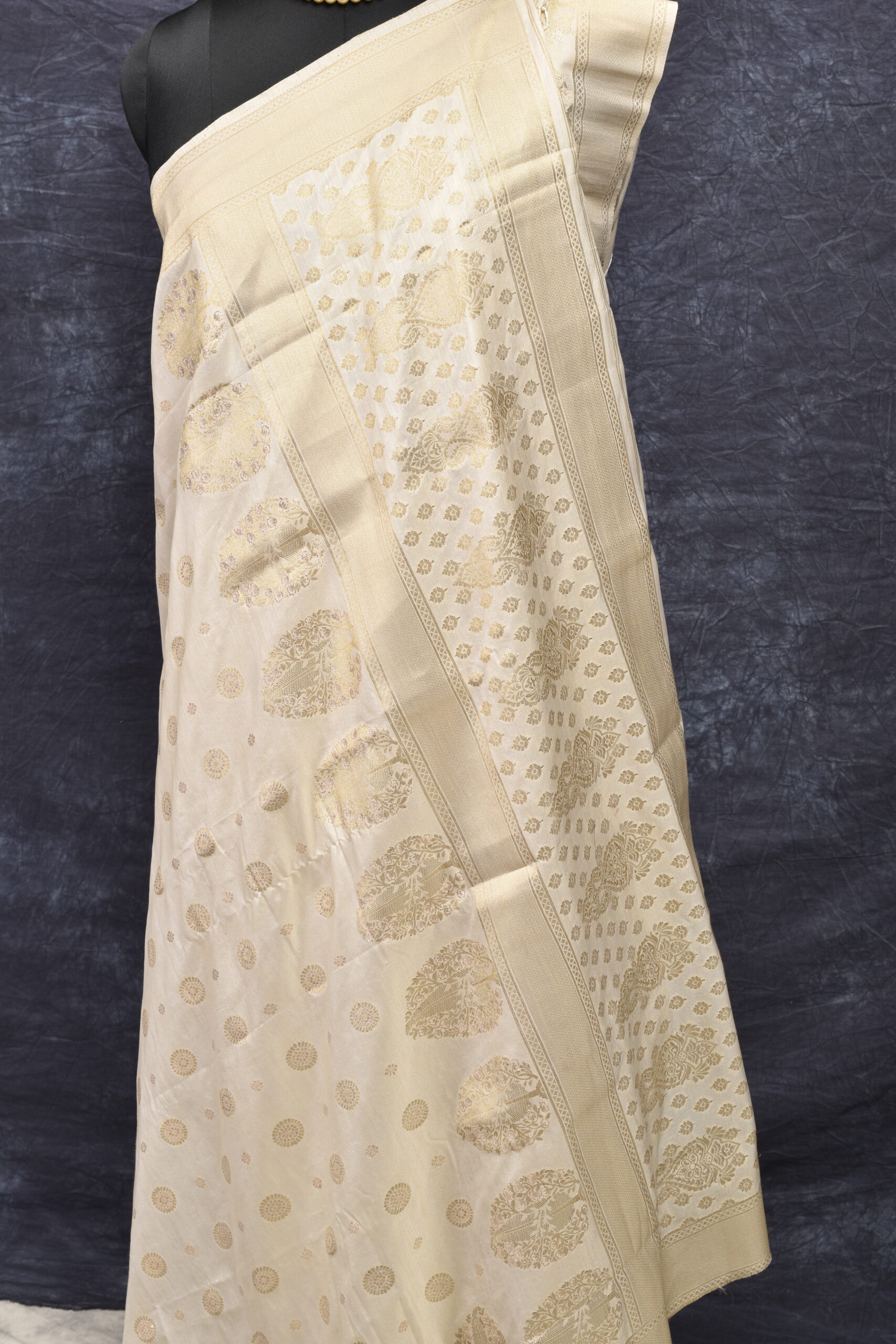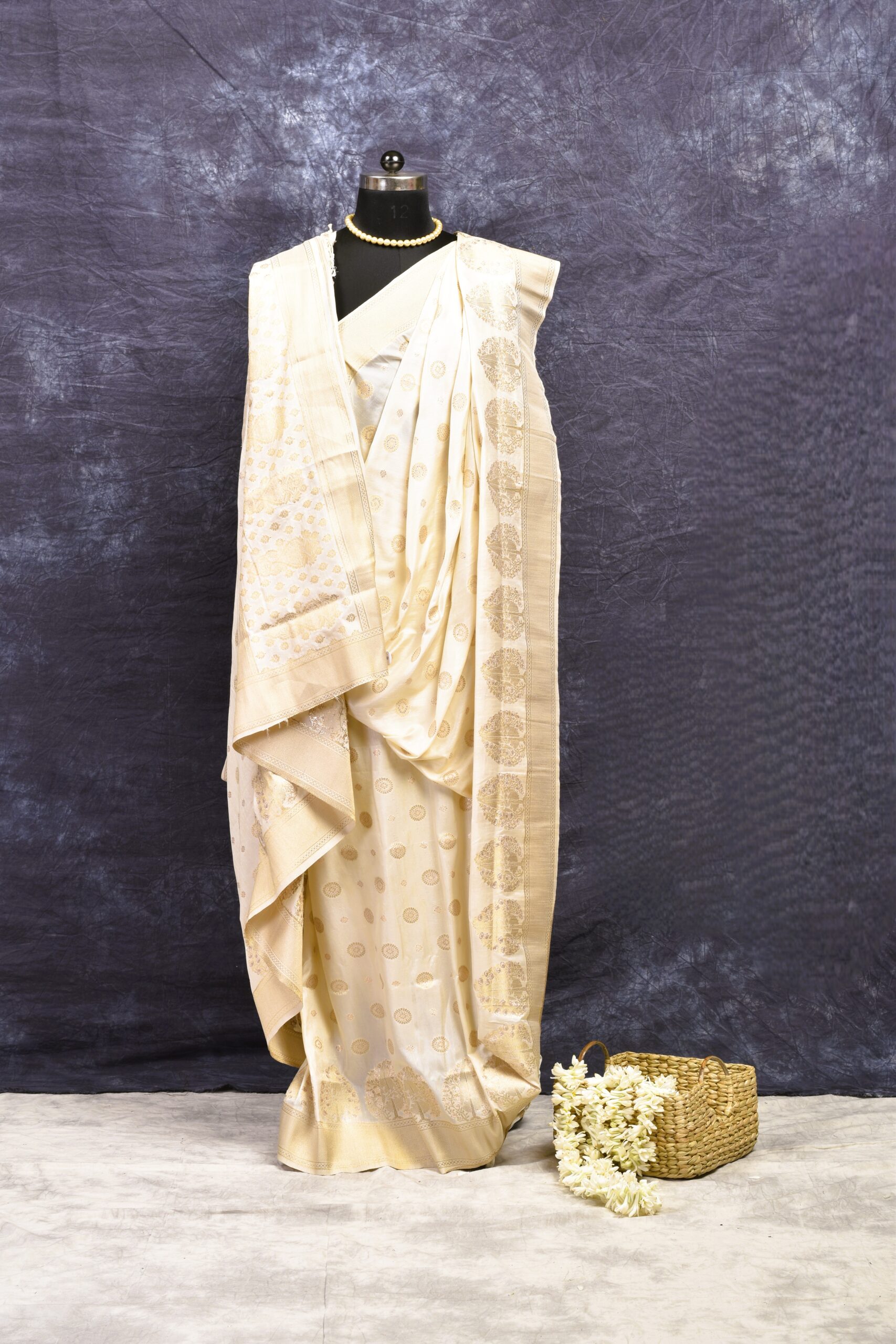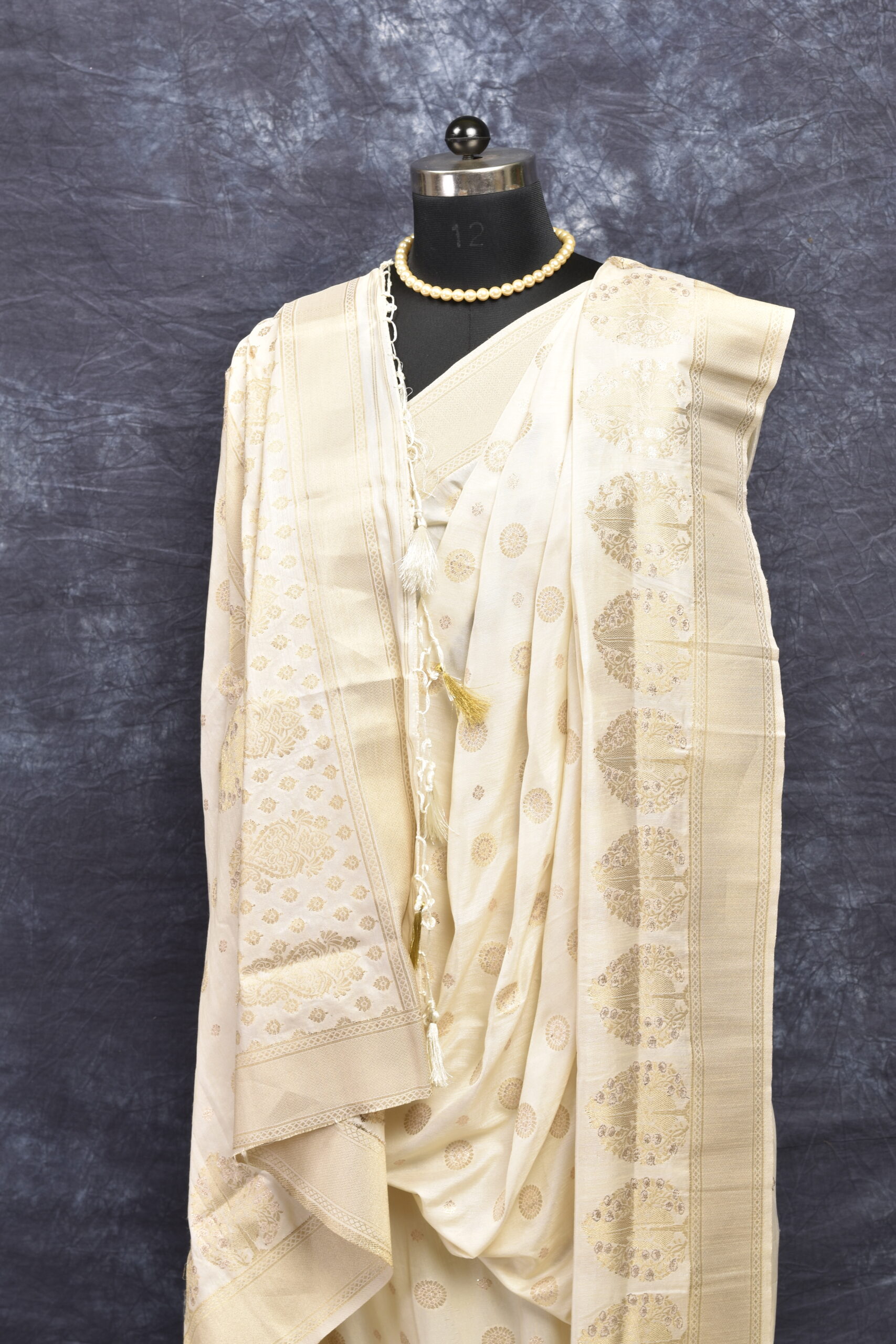 Dress Details: Semi silk saree with all over zari embroidery on light crèam base. Blouse piece available.